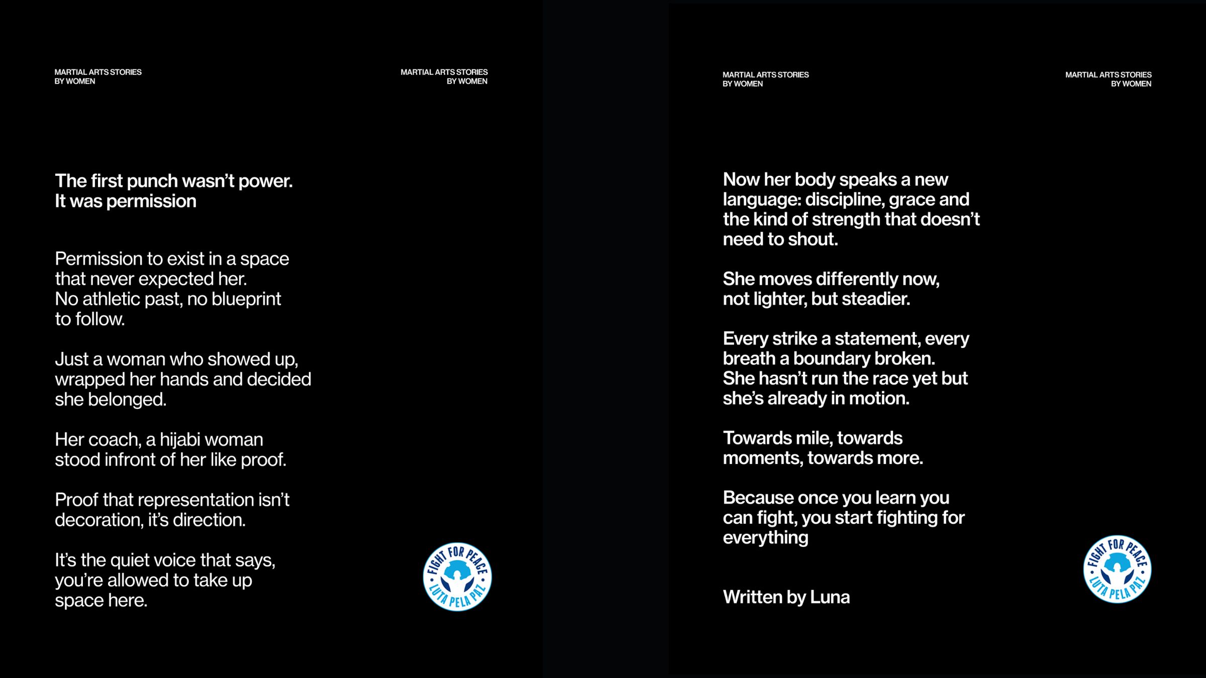 We are excited to announce that Fight for Peace’s Young Creatives have launched ‘Martial Arts Stories By Women’, a powerful new campaign amplifying the voices of women in combat sports – a space traditionally dominated by men. Despite this long-standing history, this reality is changing. Across gyms, communities, and global stages, women are not only participating – they are redefining what strength, belonging, and visibility look like. This campaign captures that shift in motion.